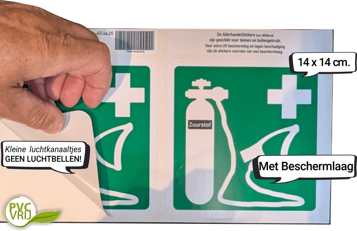 De stickers hebben een helder pictogram van een zuurstoffles met de tekst "Zuurstoffles hier aanwezig". Dit pictogram is duidelijk herkenbaar en waarschuwt anderen voor het aanwezig zijn van een zuurstoffles.