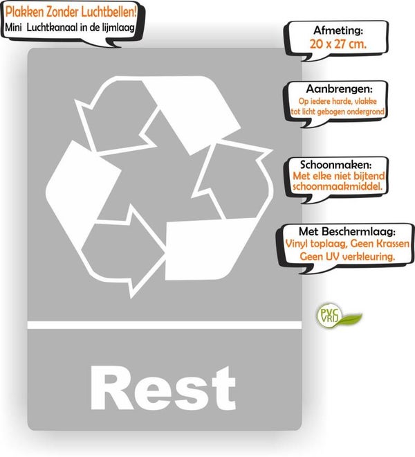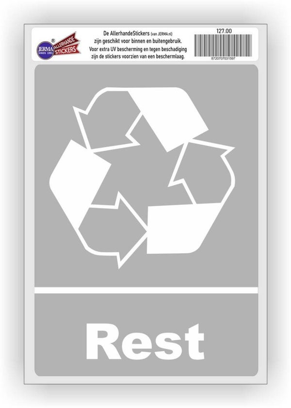 De sticker is voorzien van het pictogram voor metaalafval. De sticker is bedoeld om aan te geven dat het restafval in de recyclingbak moet worden gegooid. Restafval wordt gerecycled.