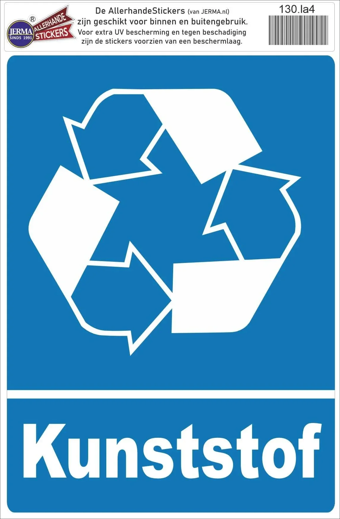 De sticker is voorzien van het pictogram voor metaal afval. De sticker is bedoeld om aan te geven dat het Kunststof in de recycling bak moet worden gegooid. Kunststof afval wordt gerecycled.