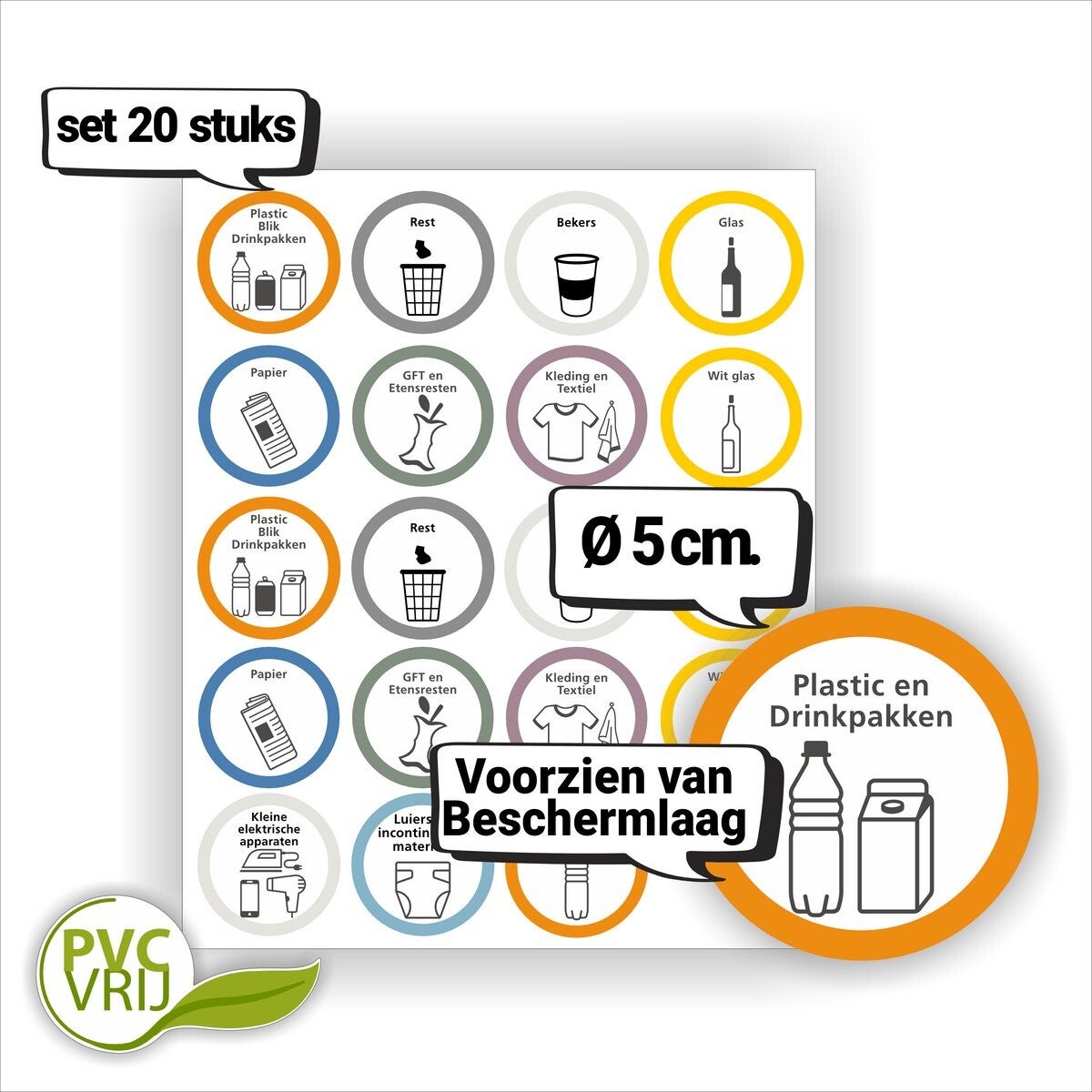 De set bestaat uit 20 stickers van Ø 5 cm groot. Elke sticker heeft een duidelijk pictogram en tekst die aangeven in welke afvalbak het afval terecht moet komen.
