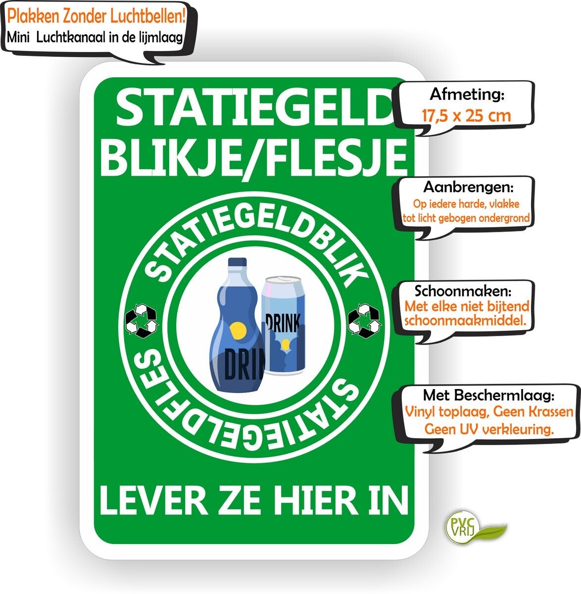Deze sticker is een effectieve manier om aan te geven waar het inzamelpunt voor lege statiegeld blikjes en flesjes is. De sticker is groot en duidelijk, met een herkenbaar symbool en de tekst "Statiegeld blikjes en flesjes hier inleveren". De sticker is gemaakt van duurzaam materiaal en is geschikt voor zowel binnen als buiten gebruik.
