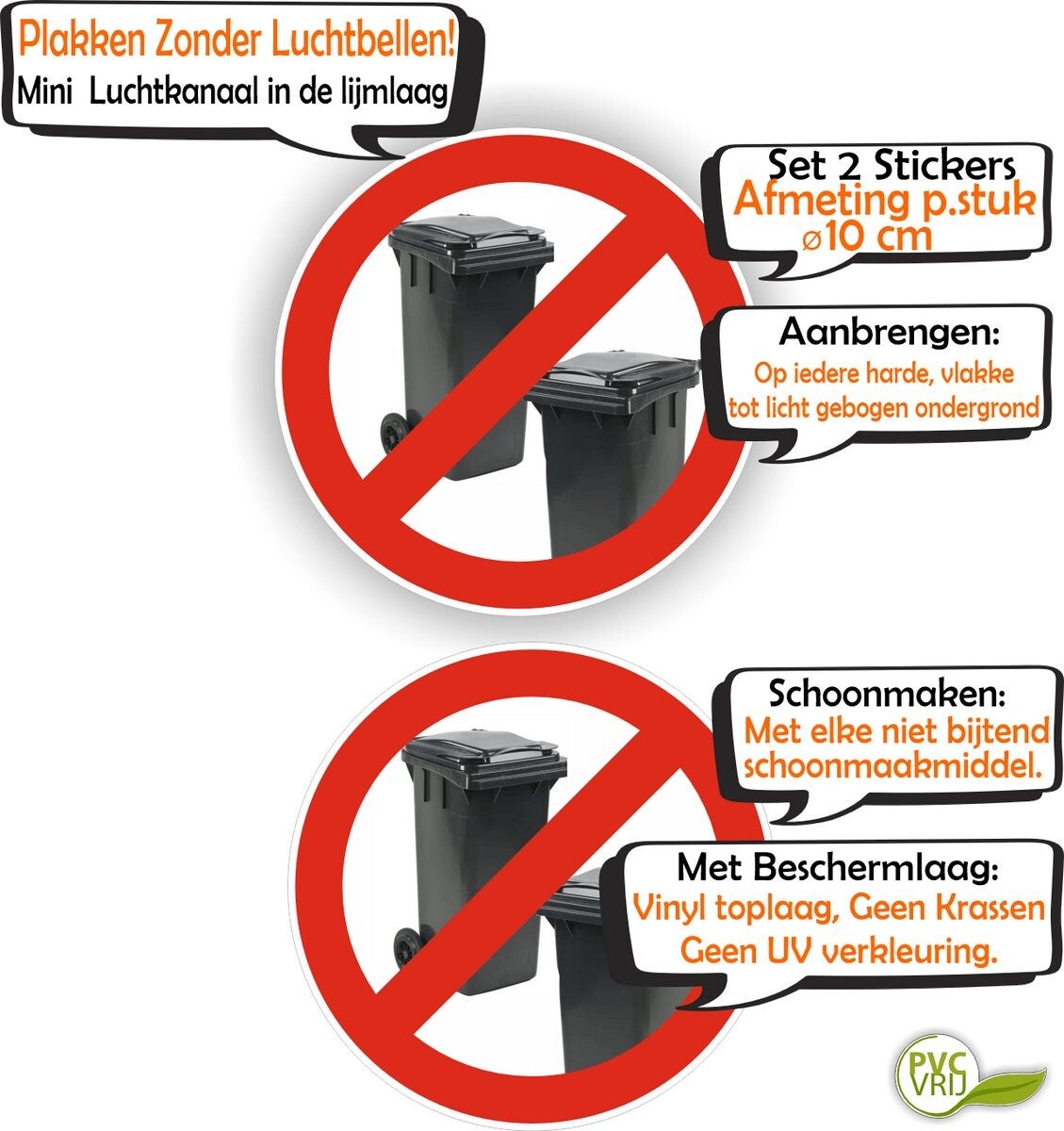 Toepassingen: de stickers kunnen worden gebruikt om afvalbakken, kliko's en andere afvalcontainers te markeren als niet-plaatsbaar. Dit kan bijvoorbeeld worden gedaan bij: