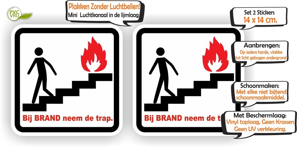 Sticker bij brand, neem de trap, set van 2 stuks, is een duidelijke en herkenbare sticker die aangeeft dat je bij brand de trap moet gebruiken.