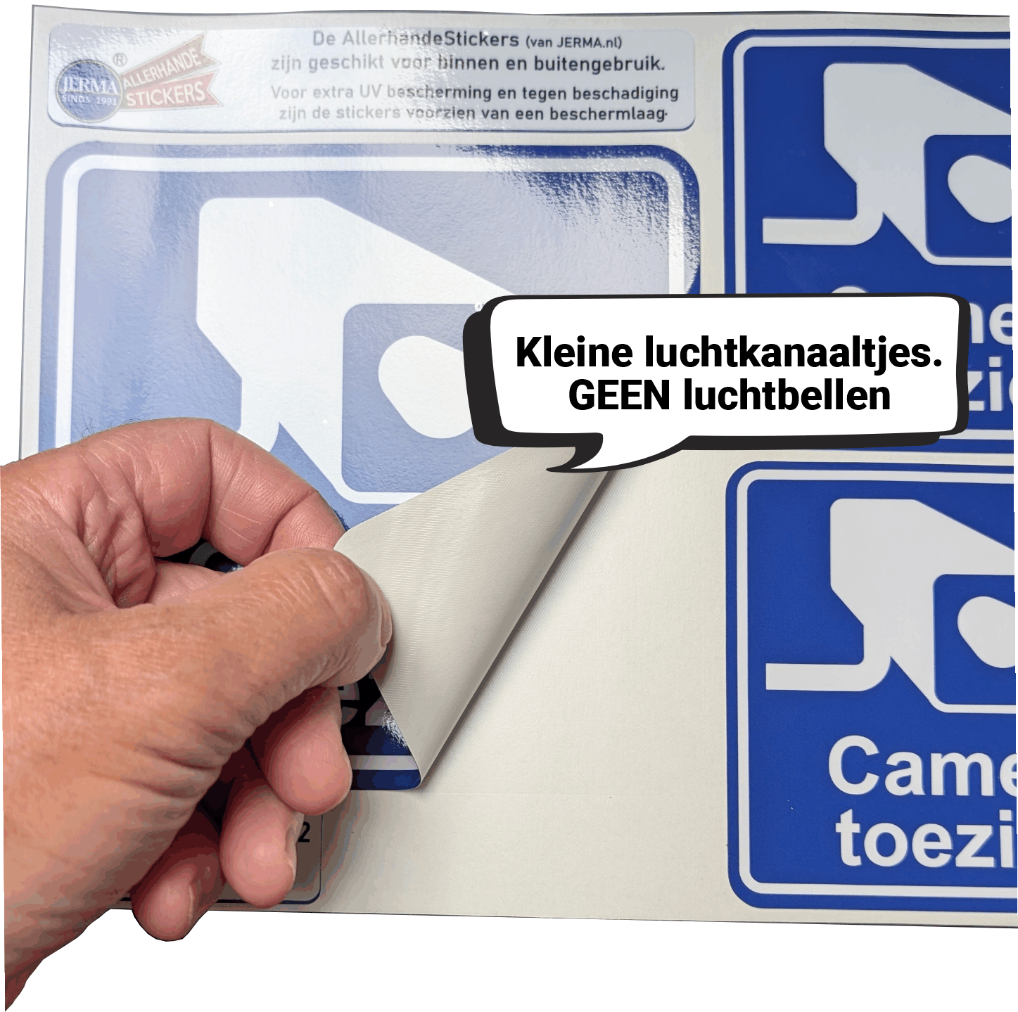 - De stickers zijn duidelijk zichtbaar en maken bezoekers ervan bewust dat er camerabewaking is.