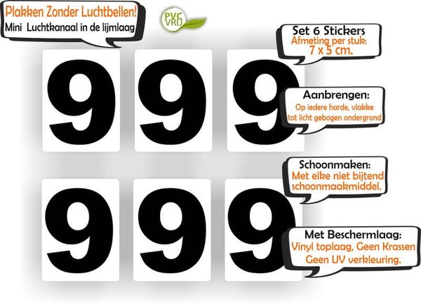 De zwarte cijfers staan op een witte ondergrond. De afmeting per sticker is: 7 cm hoog en 5 cm breed