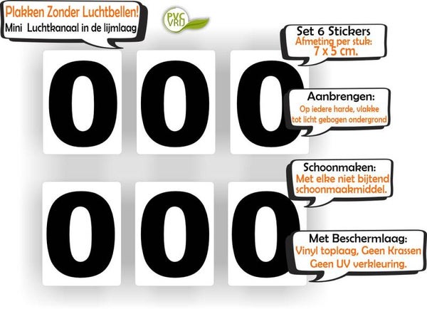 De zwarte cijfers staan op een witte ondergrond. De afmeting per sticker is: 7 cm hoog en 5 cm breed