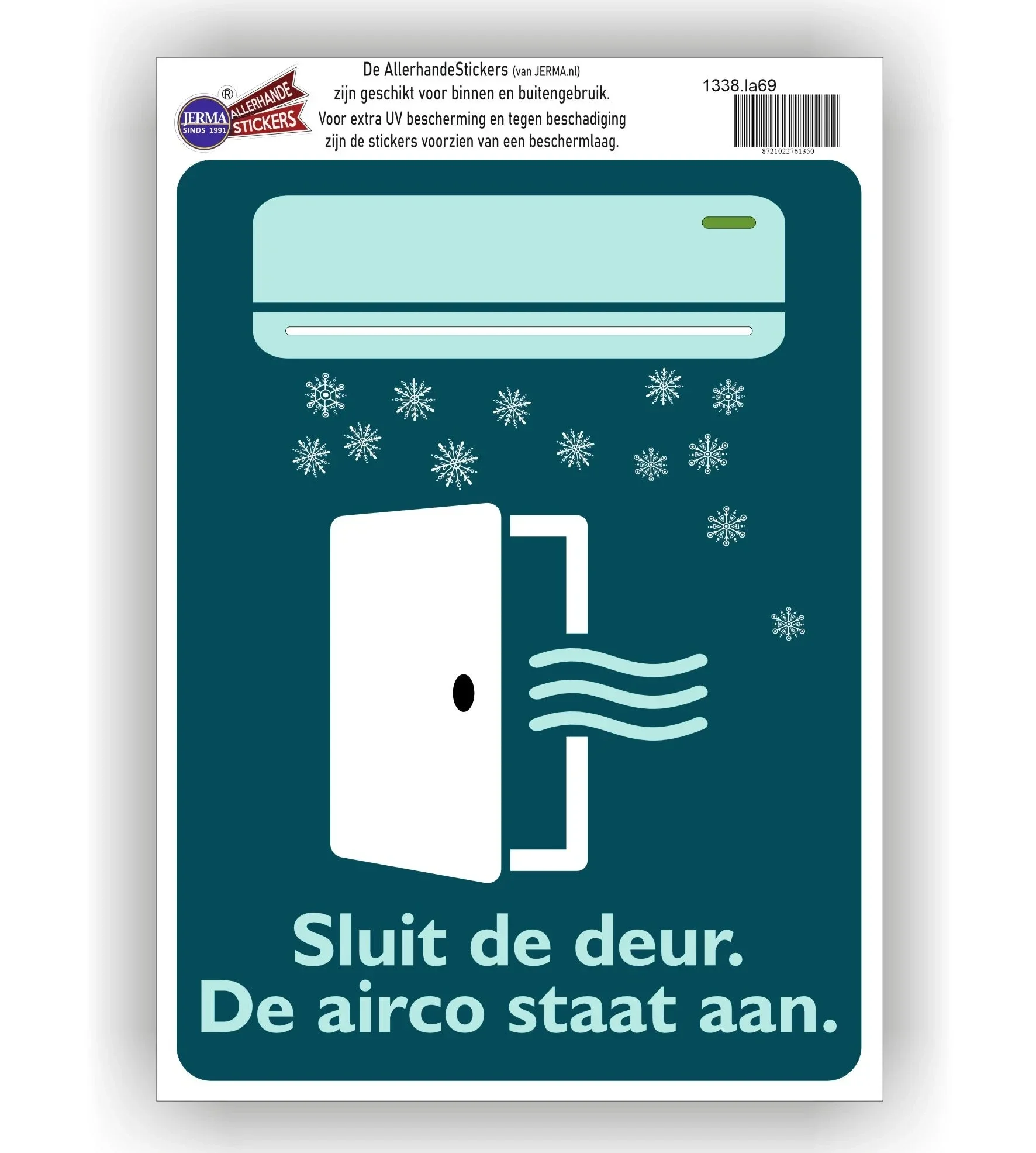 - Tekst: "Deur sluiten, de airco staat aan"