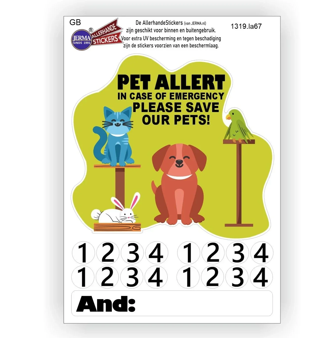 Deze sticker is onmisbaar voor iedereen met huisdieren. In geval van brand is het voor de hulpdiensten vaak onduidelijk of er huisdieren in huis aanwezig zijn. Met deze sticker weten ze dat meteen!