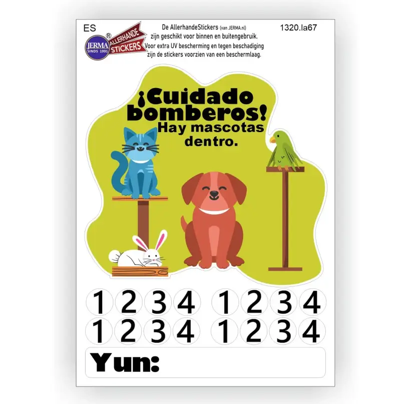 Deze sticker is onmisbaar voor iedereen met huisdieren. In geval van brand is het voor de hulpdiensten vaak onduidelijk of er huisdieren in huis aanwezig zijn. Met deze sticker weten ze dat meteen!