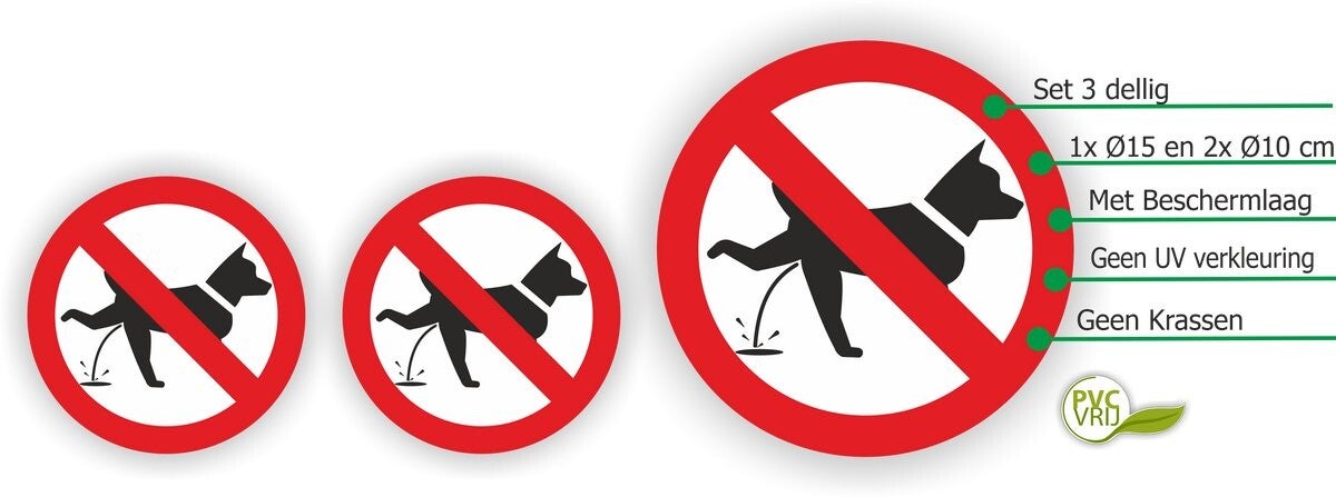 Met deze duidelijke stickerset laat je hondeneigenaren weten dat hun honden niet mogen plassen op de plek waar de stickers zijn aangebracht. De stickers zijn geschikt voor binnen- en buitengebruik en zijn gemaakt van hoogwaardig vinyl met een zelfklevende achterkant.