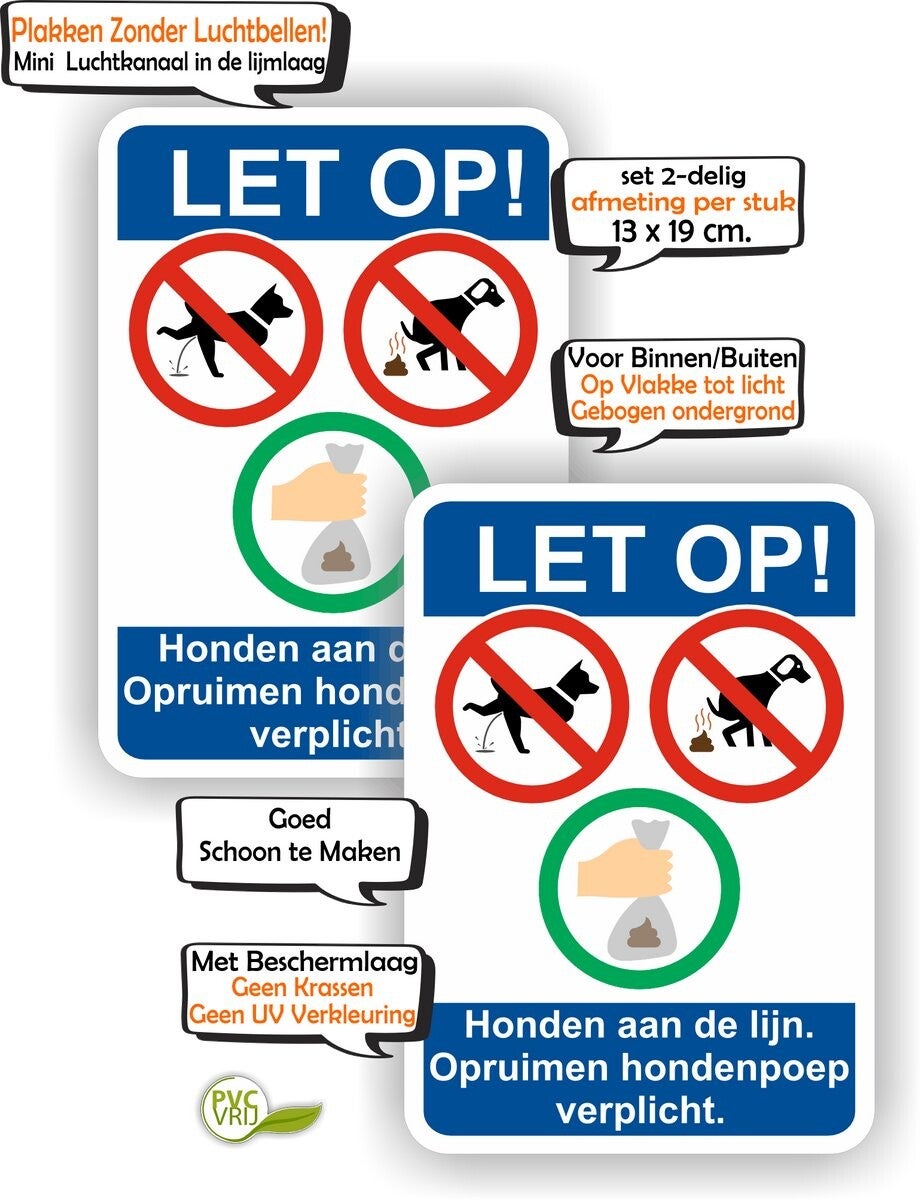 Duidelijke boodschap voor een schone omgeving: "Honden aan de lijn - Niet poepen, plassen - Poep opruimen" sticker set van 2 stuks.