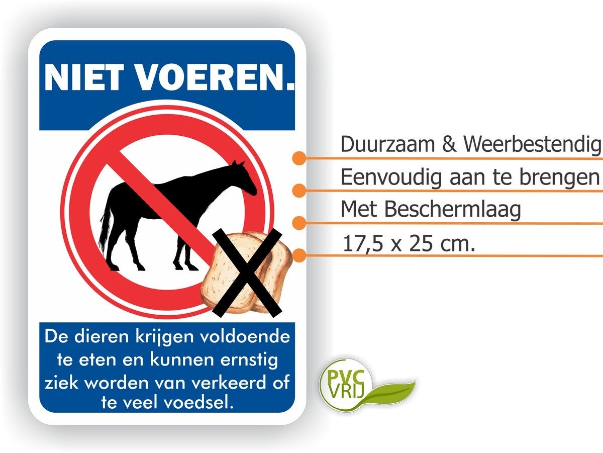 - Met onze Paarden niet voeren sticker kunt u uw paarden beschermen tegen verkeerd voer. De sticker is duidelijk zicht-, leesbaar en zal mensen ertoe aanzetten om de paarden niet te voeren.
