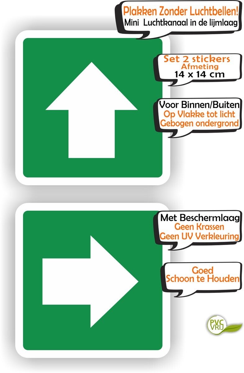 Deze set van 2 pijlrichtingaanwijzers is ideaal voor het geven van duidelijke aanwijzingen. De pijlen zijn 14 x 14 cm groot en zijn gemaakt van vinyl met een zelfklevende achterkant. De stickers zijn geschikt voor binnen- en buitengebruik en zijn goed te reinigen.