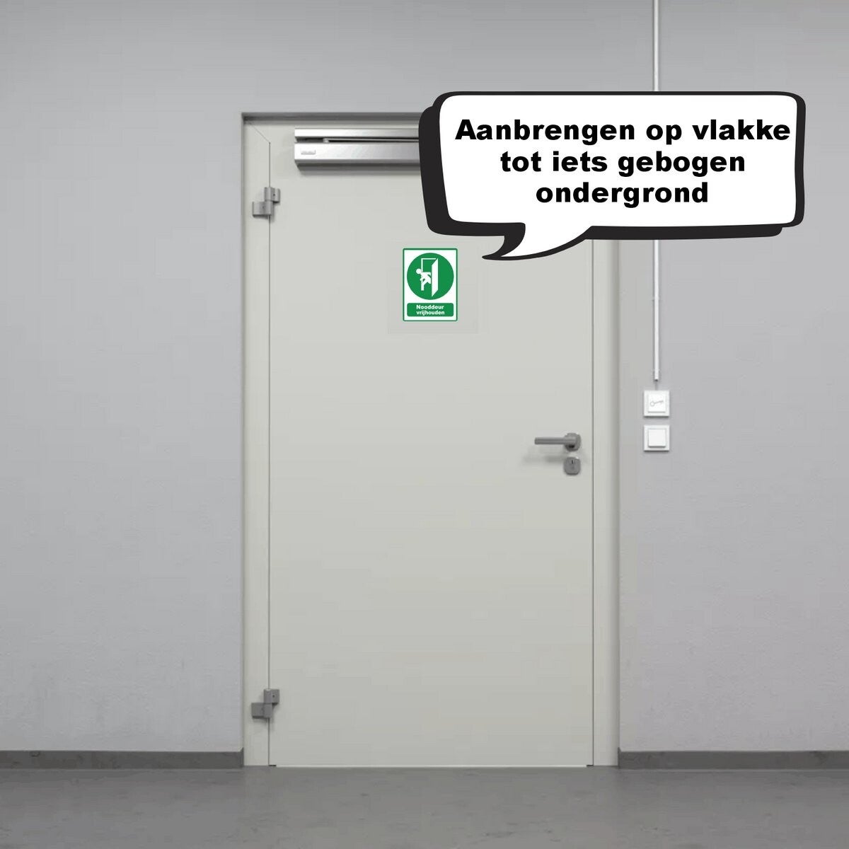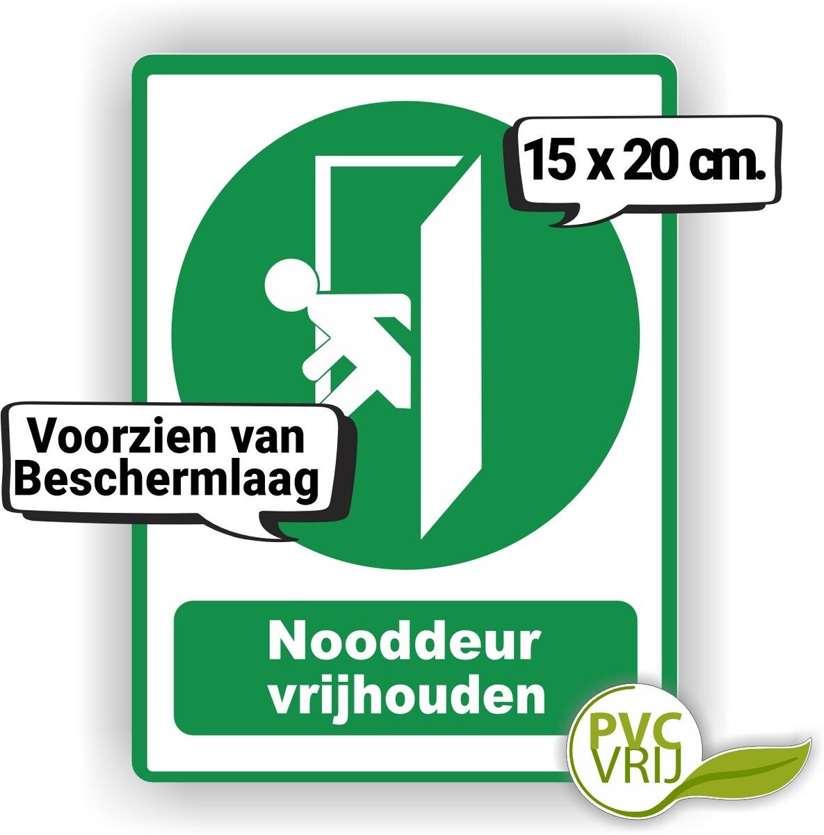 De sticker heeft een duidelijk pictogram: de sticker is bedoeld om mensen te herinneren om de nooduitgangen, nooddeuren en vluchtdeuren vrij te houden t.b.v. de evacuatie.