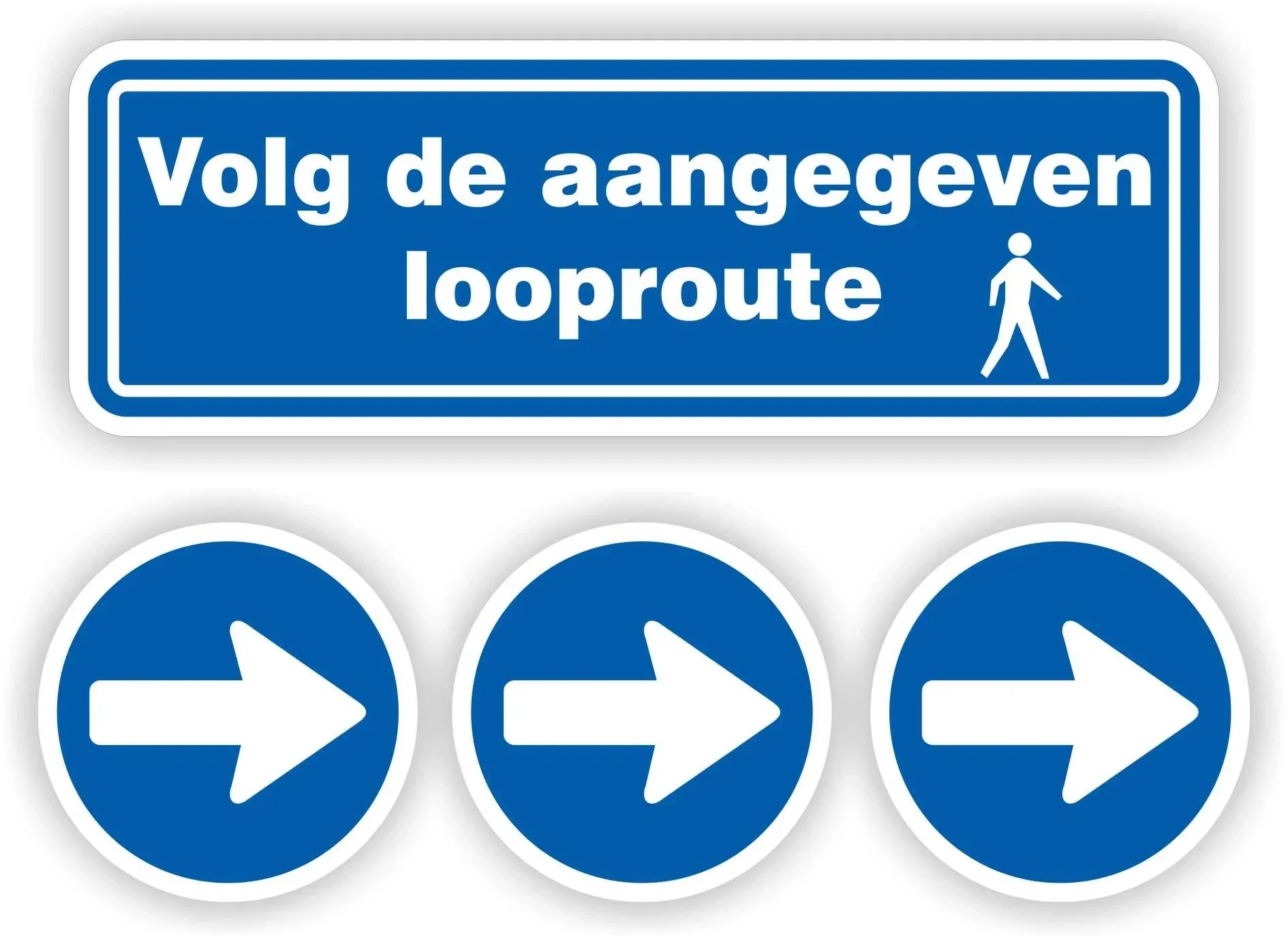 De tekst sticker heeft de tekst "Volg de aangegeven looproute" in blauw op een witte achtergrond. De richtingspijlen zijn blauw met een witte pijl.