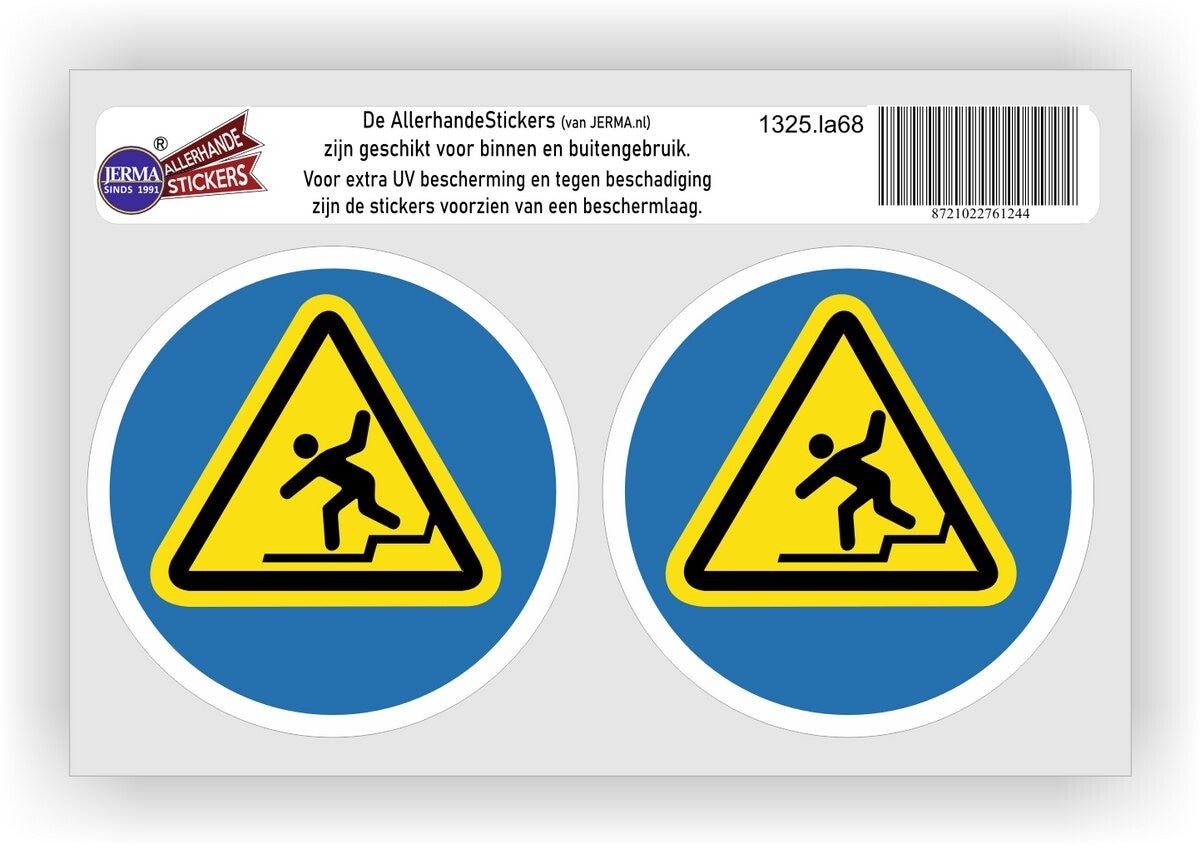 Deze set van 2 stickers met afmetingen van Ø10 cm per stuk is de ideale oplossing om mensen te waarschuwen voor hoogteverschillen en valgevaar. Met een duidelijk pictogram zorg je voor een universele waarschuwing die door iedereen begrepen wordt, ongeacht de taal.
