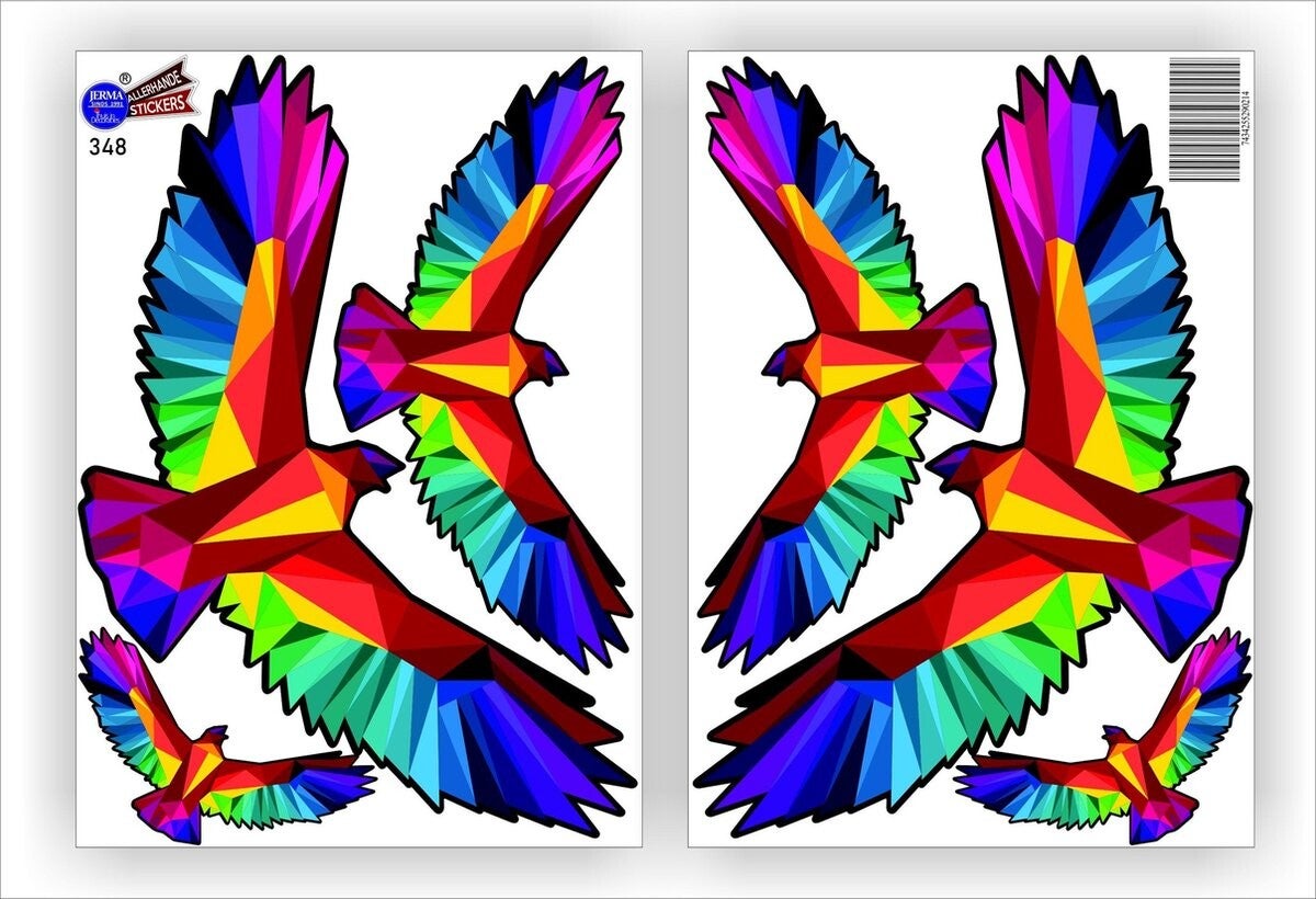 De afmeting van de vogelstickers is: 2 stuks van ± 12 x 6, 2 van ± 22 x 10 en 2 vogels van ± 32 x 14 cm groot.