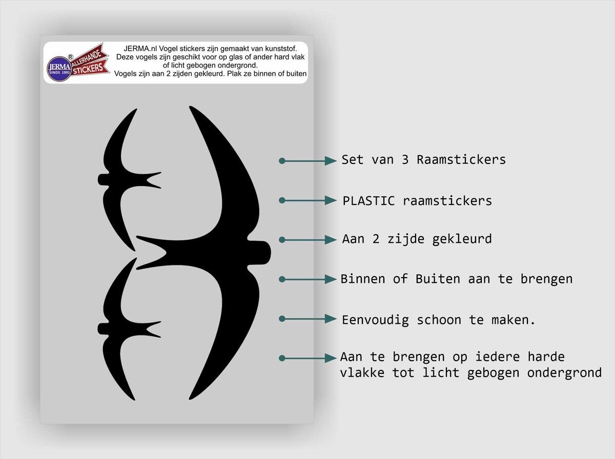 - De set bevat 3 zwarte vogelbescherming stickers.