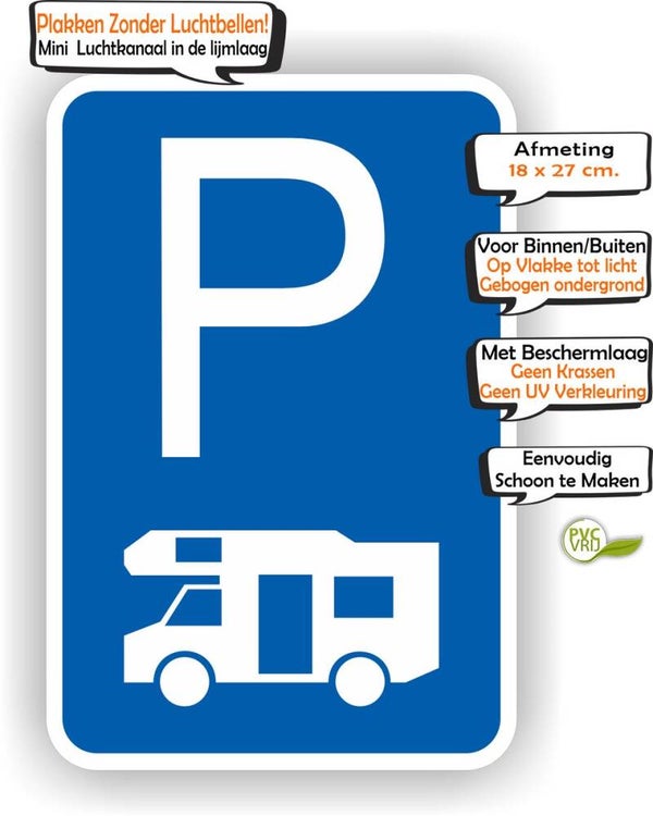 Deze professionele camperparkeerplaats-verkeersbordsticker is dé oplossing om snel en zichtbaar aan te geven waar campers zijn toegestaan. Met een royaal formaat van 18 x 27 cm, heldere opdruk en officiële uitstraling, is deze sticker perfect voor campings, camperplaatsen, parkeerterreinen en privélocaties.