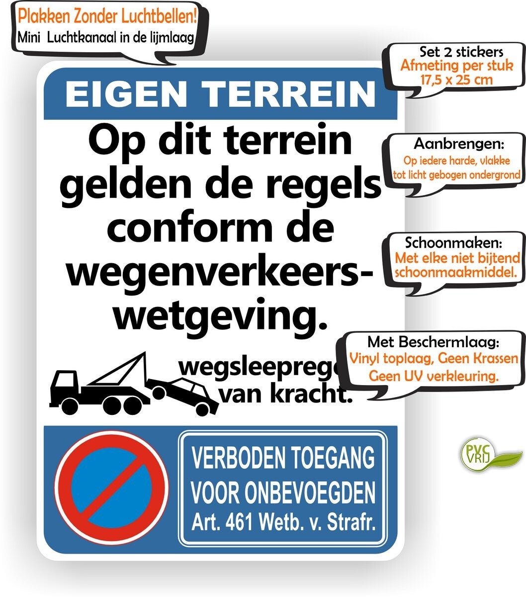 Met deze opvallende verkeersbord sticker laat u bezoekers, leveranciers en voorbijgangers weten dat de regels van het Reglement Verkeersregels en Verkeerstekens (RVV) op uw terrein van toepassing zijn. Bovendien geeft het herkenbare sleepwagensymbool glashelder aan dat onbevoegd geparkeerde voertuigen worden weggesleept.