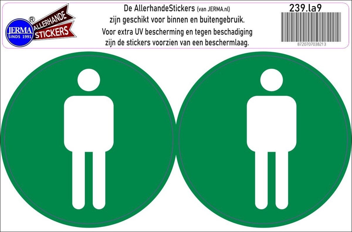 Met onze heren toilet pictogram stickers maak je het voor iedereen duidelijk waar de herentoiletten te vinden zijn. De stickers zijn groot en duidelijk zichtbaar, waardoor ze ook vanuit de verte goed te zien zijn. De groene kleur is herkenbaar en zorgt voor een frisse uitstraling.