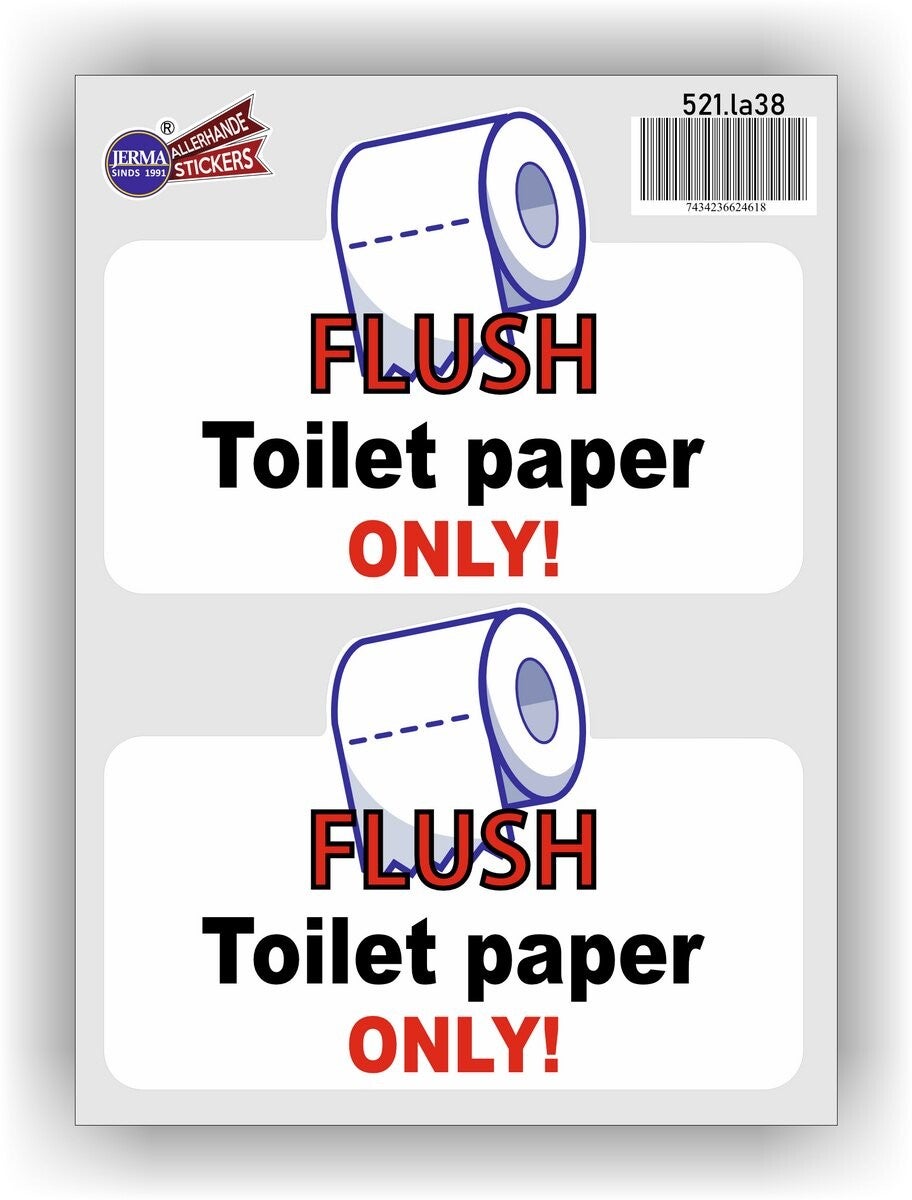 Voorkom verstoppingen en houd uw toiletten probleemvrij – bestel nu deze set “Flush toilet paper only” stickers van Jerma Allerhandesticker!