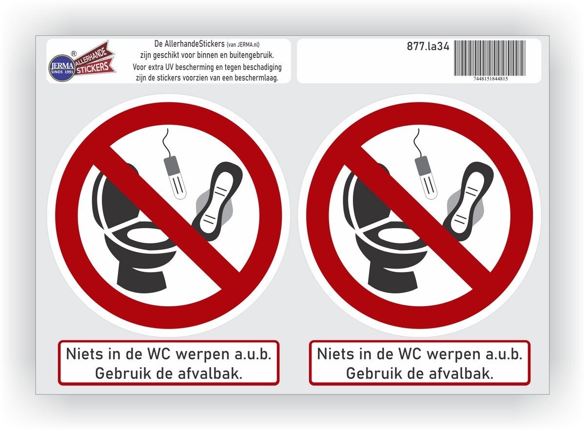 Ben je het zat dat er spullen in het toilet worden gegooid die er niet thuishoren? Deze complete stickerset van 4 stuks biedt de perfecte oplossing om bezoekers van je toilet subtiel te informeren over correct toiletgebruik. Voorkom ongemakkelijke situaties en dure verstoppingen met deze duidelijke en duurzame stickers.