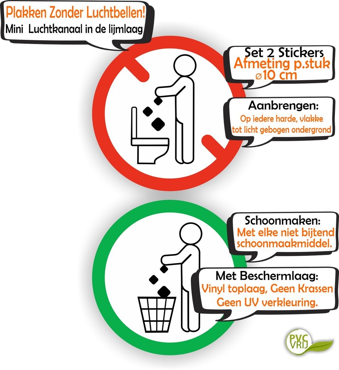 De set bestaat uit 2 ronde stickers met een diameter van 10 cm. Ze zijn opvallend, eenvoudig te begrijpen en geschikt voor gebruik in toiletruimtes van woningen, bedrijven en openbare gebouwen.