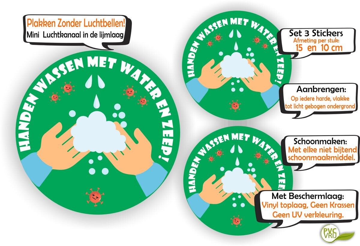Stickers “Handen wassen met zeep en water” – Set van 3 – Ø15 cm & Ø10 cm – Hygiëne-stickers voor kinderen