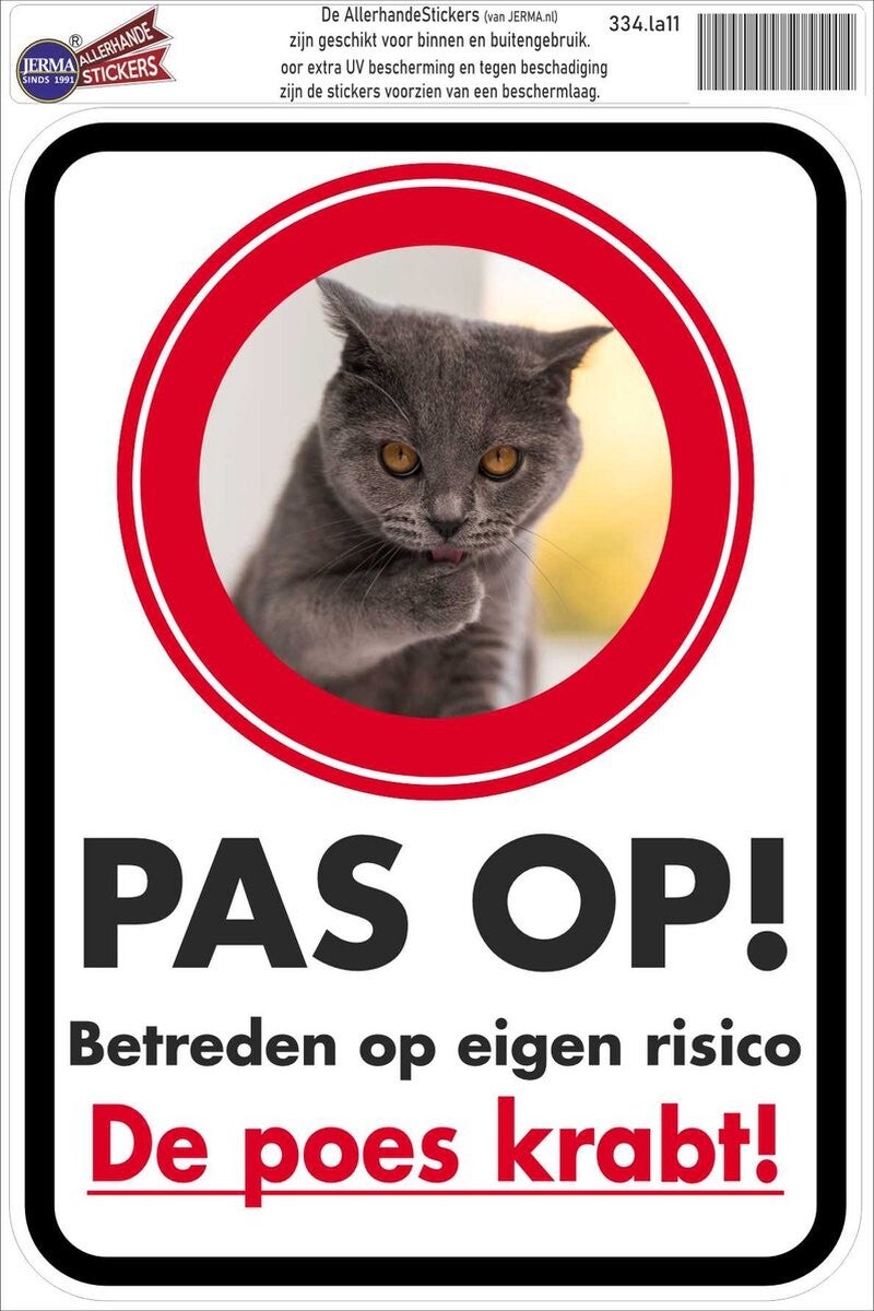 De sticker is een goede manier om mensen te waarschuwen voor een gevaarlijke poes. De sticker is groot en duidelijk, zodat deze gemakkelijk te zien is. De sticker is ook goed bestand tegen weersinvloeden, waardoor deze lange tijd meegaat.