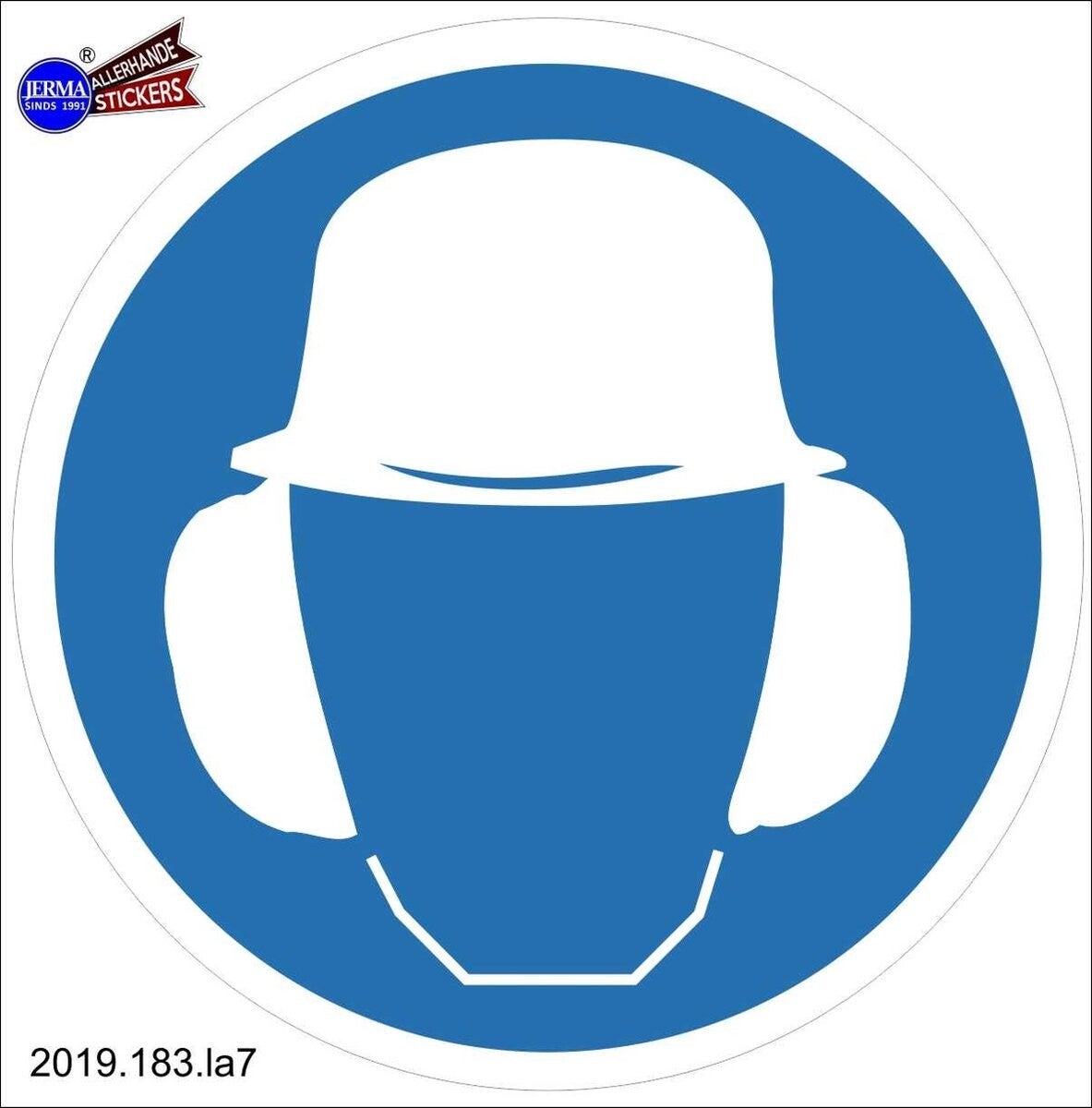 Veiligheidshelm en gehoorbescherming verplicht sticker Ø20 cm is een sticker met een pictogram dat aangeeft dat het dragen van veiligheidshelm en gehoorbescherming verplicht is.