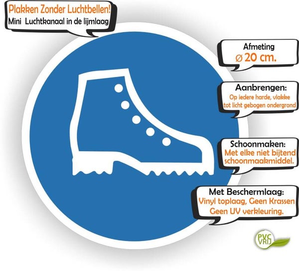 De Veiligheidsschoenen verplicht sticker Ø20 cm is een praktische, duurzame en eenvoudig aan te brengen oplossing om het dragen van veiligheidsschoenen te communiceren. Dankzij het hoogwaardige PVC-vrije vinyl, de acrylkleefstof en de beschermlaag is de sticker geschikt voor vrijwel elke harde ondergrond binnen en buiten. Een must-have voor werkplekveiligheid en persoonlijke beschermingsmiddelen.