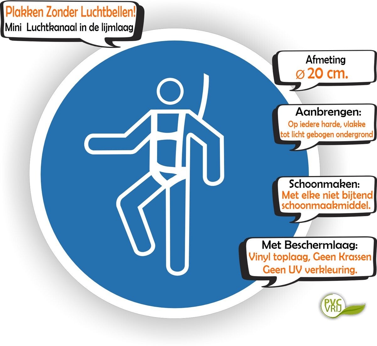 De valbeveiliging-verplicht-sticker Ø20 cm is een duidelijke en duurzame veiligheidssticker die aangeeft dat het dragen van valbeveiliging verplicht is.