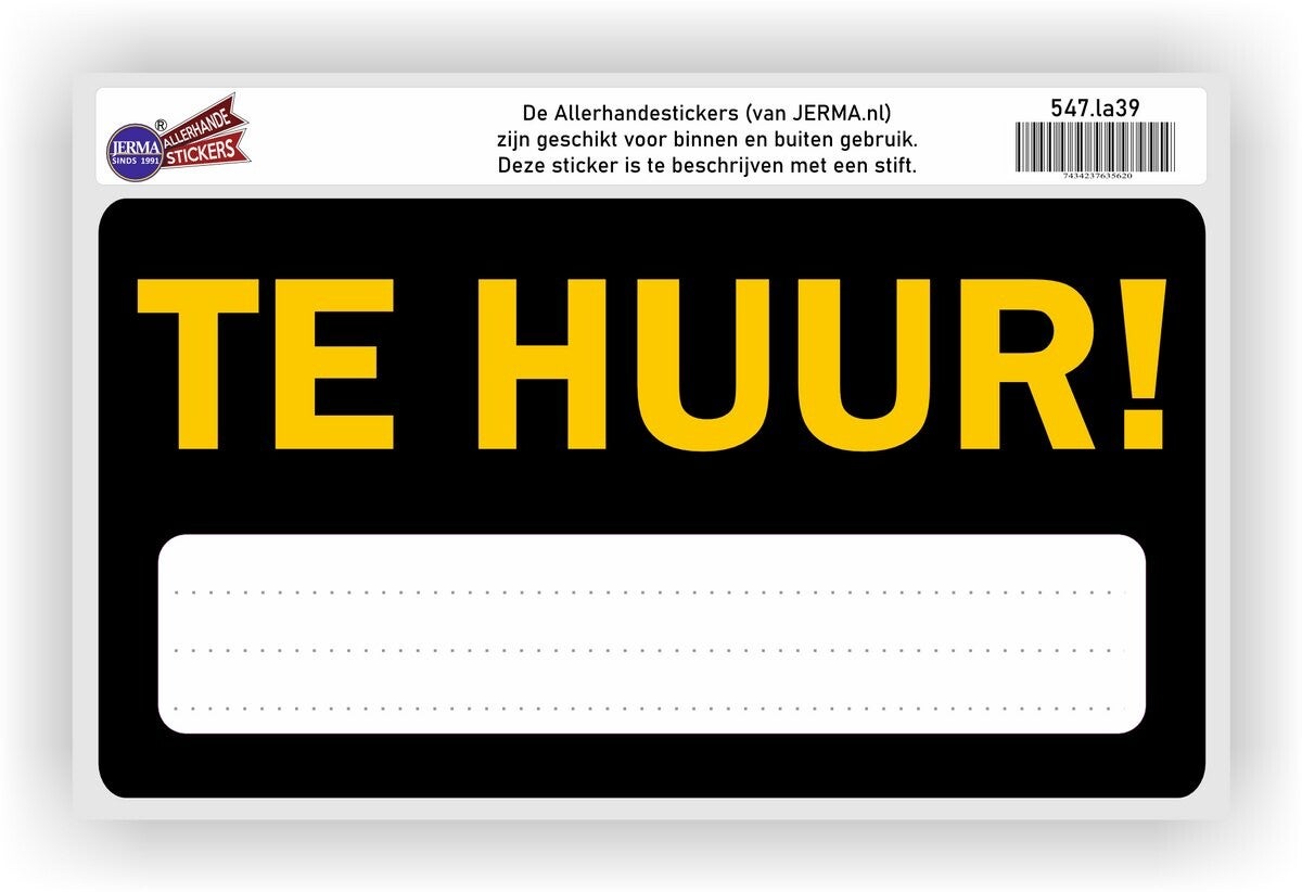 Wilt u uw woning, voertuig, caravan of ander object snel en professioneel onder de aandacht brengen? Met deze opvallende "TE HUUR"-sticker van Jerma.nl is uw boodschap niet te missen. Dankzij het royale formaat van 29 x 15,5 cm en het heldere ontwerp trekt u direct de aandacht van potentiële kopers.