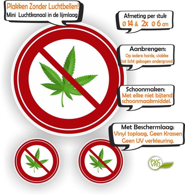 Blowen, weed, cannabis niet toegestaan-stickers – set van 3 stuks (Ø 14 cm & Ø 6 cm)