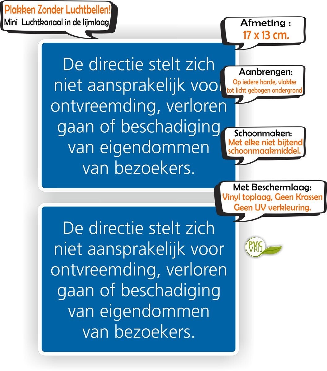 Geef op een duidelijke en professionele manier aan dat de directie niet aansprakelijk is voor schade, diefstal of verlies met deze praktische stickerset van 2 stuks. Perfect voor restaurants, winkels, openbare ruimtes, kantoorgebouwen, sportterreinen en festivals.