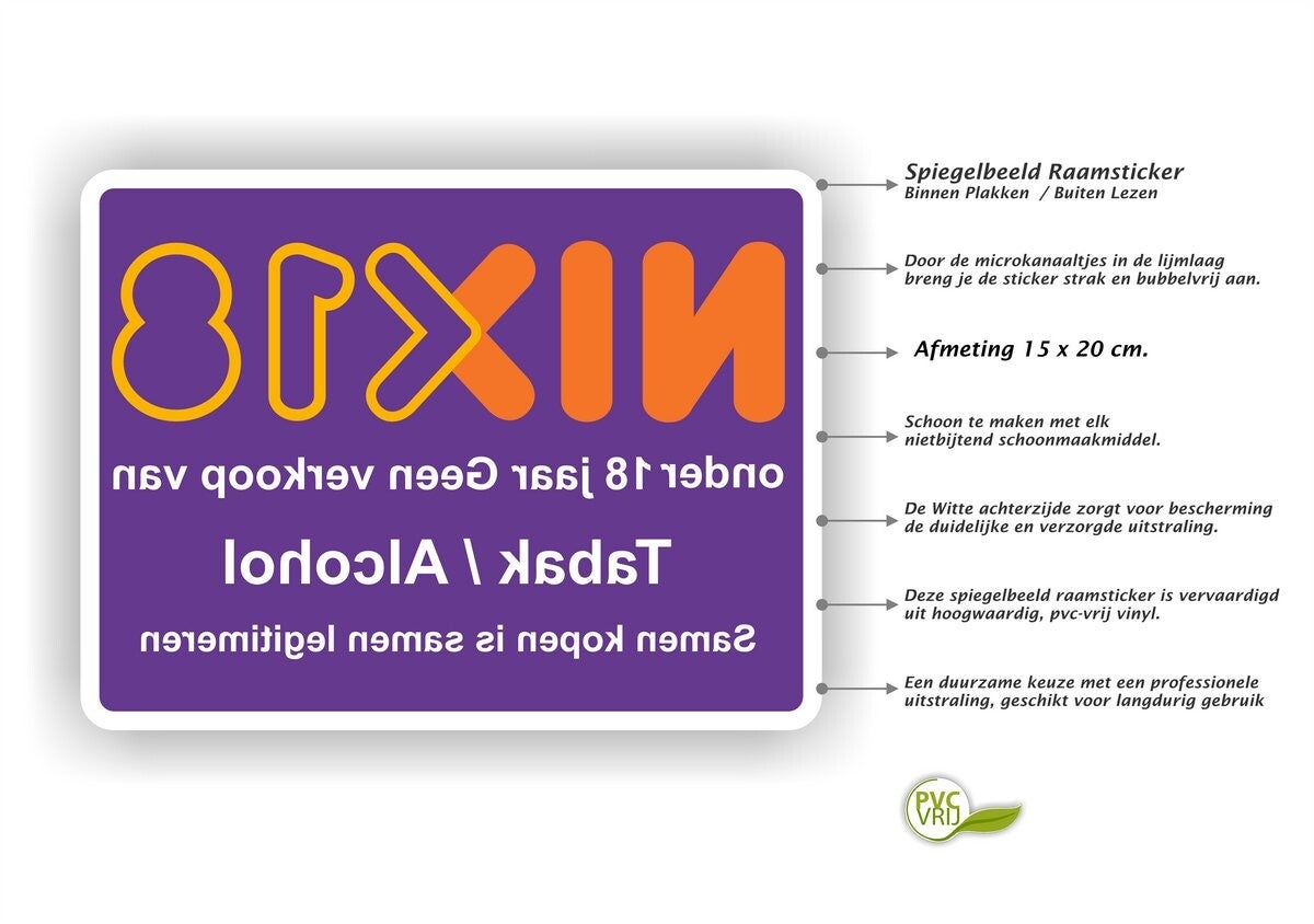 NIX18-sticker • Geen tabak of alcohol-raamsticker • NIX18-raamsticker spiegelbeeld • NIX18-bordje alternatief • Horeca-raamsticker NIX18 • Tabak-alcohol-verboden-sticker • Winkel-raamsticker NIX18 • NIX18-glassticker binnen plakken buiten lezen • NIX18-aanduiding-sticker • NIX18-naleving-sticker.