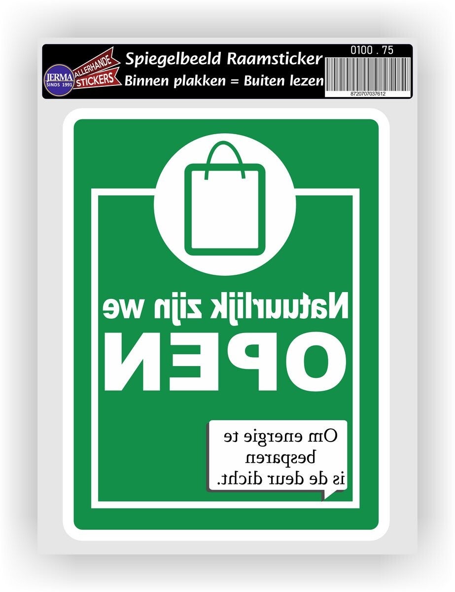 raamsticker winkel open – deur dicht sticker – energie besparen winkel – spiegelbeeld raamsticker – winkelsticker deur dicht – raamsticker binnen plakken buiten lezen – energiebesparende sticker winkel