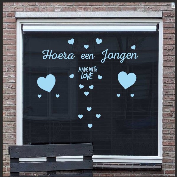 De geboorte van een zoon is een bijzonder moment vol liefde en geluk. Met deze unieke raamsticker laat je iedereen weten dat jullie gezin is uitgebreid met een kleine jongen. De tekst "EEN JONGEN Made with love" en de bijgeleverde hartjes maken de aankondiging extra speciaal.