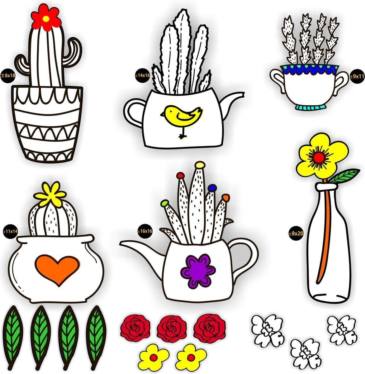 Deze set is een speelse mix van cactussen in zwart-wit vaasjes en kleurrijke bloemen. Omdat je de stickers naar eigen inzicht kunt plakken, creëer je altijd een persoonlijke look die precies bij jouw stijl past.