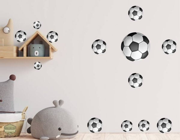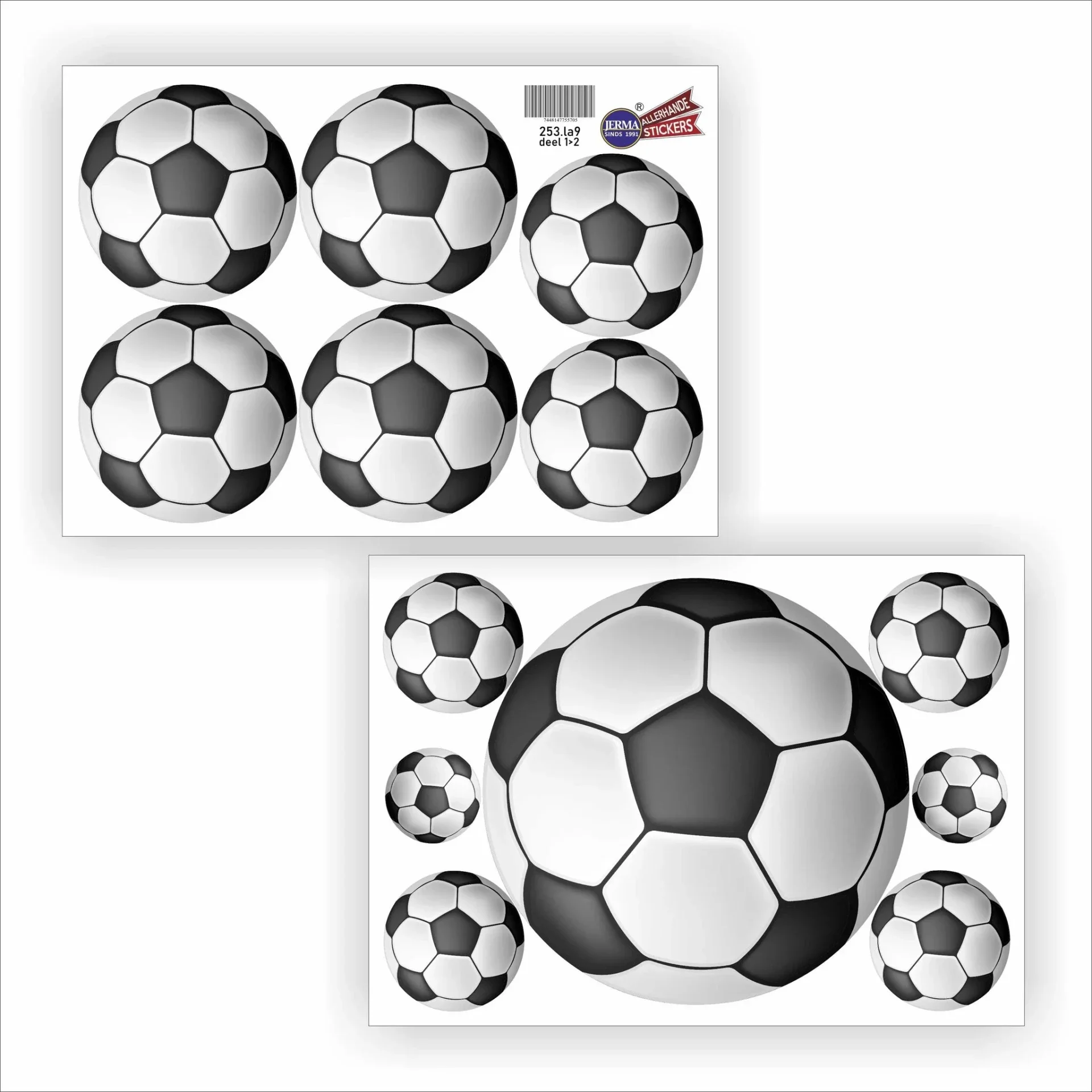 In plaats van een grote sticker ontvang je een gevarieerde set van maar liefst 13 voetballen. Dit geeft je de vrijheid om je eigen unieke patroon te creëren. Laat de ballen "over de muur rollen" of verdeel ze over de kamer voor een rustig maar sportief thema.