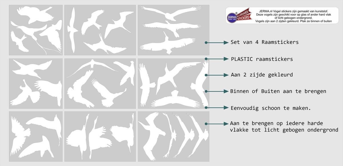 Bestel vandaag nog deze set van 31 vogelraamstickers en draag bij aan een vogelvriendelijke omgeving.