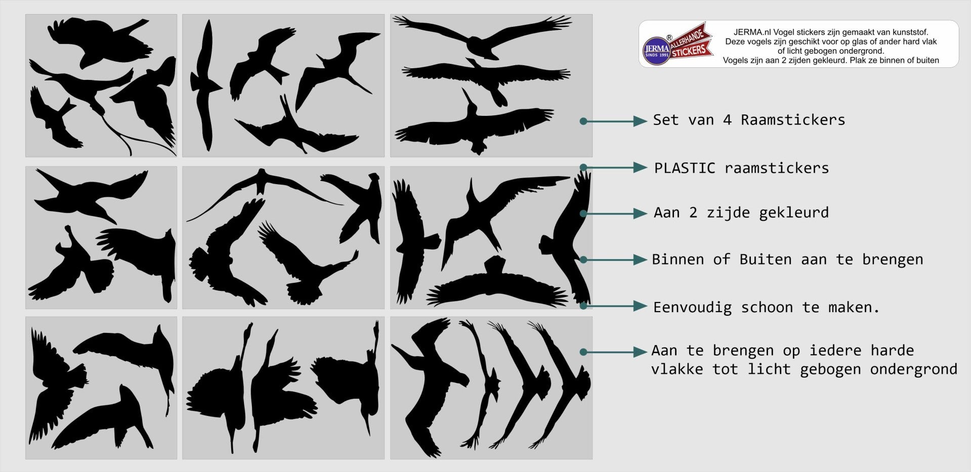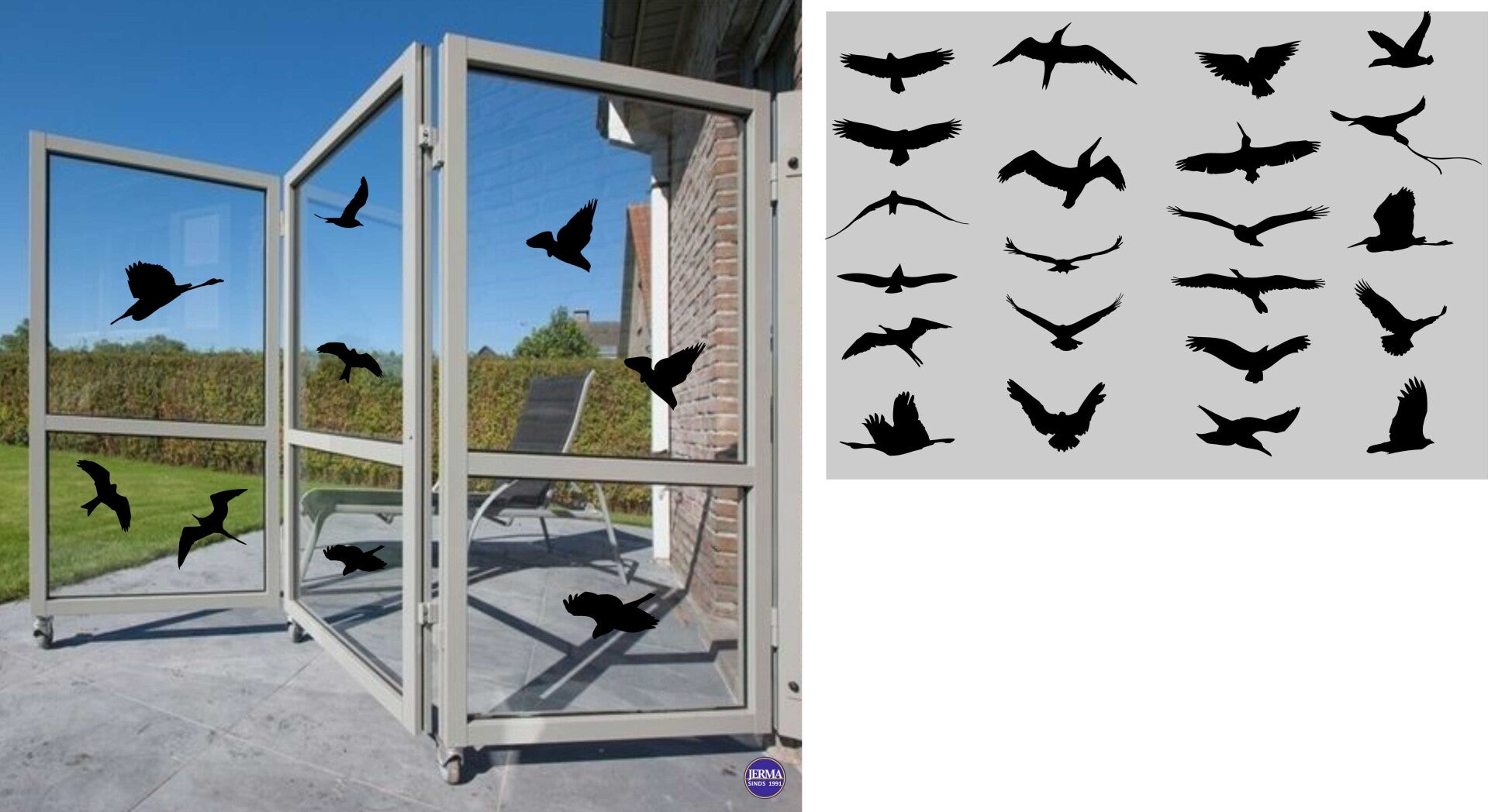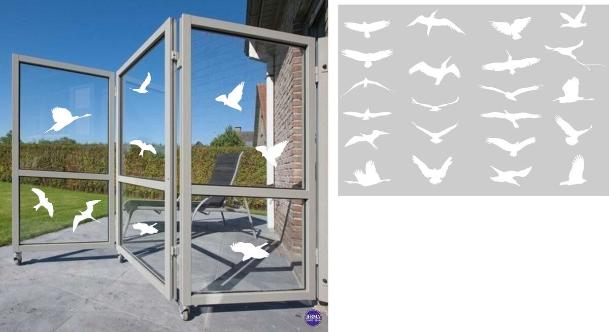 Voorkomt vogelbotsingen – vogels zien de stickers als obstakels en vliegen er niet tegenaan.