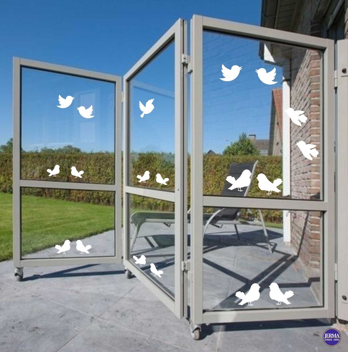 Vogelbescherming-raamsticker set: 23 witte twitterende vogels.