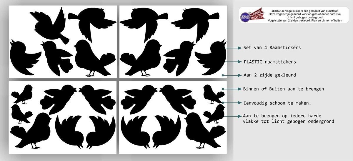 De afmeting van de vogelstickers is tussen 5,5x5,5 en 10x10 cm groot.