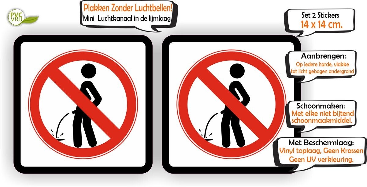 Sticker set Verboden te plassen – 2 stuks – 14x14 cm – Vinyl – Zelfklevend.
