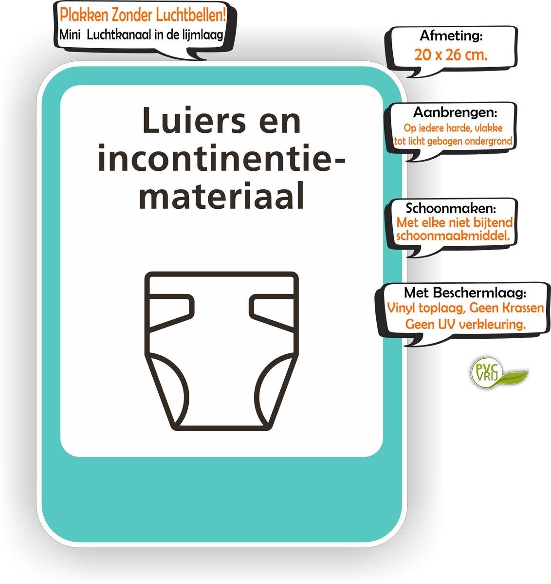 De sticker heeft een formaat van 20 x 26 cm en is voorzien van een duidelijk pictogram van een luier in mintgroen, de officiële kleur voor luiers en incontinentiemateriaal die gerecycled kan worden.
