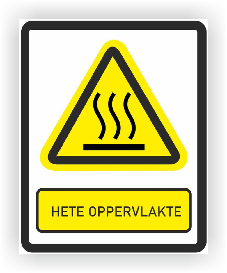 De sticker waarschuwt gebruikers voor het risico op brandwonden bij contact met een heet oppervlak. Deze waarschuwingssticker is volgens de ISO 7010-norm en heeft het symbool voor een heet oppervlak. De tekst op de sticker is: "Heet oppervlak. Kan brandwonden veroorzaken."