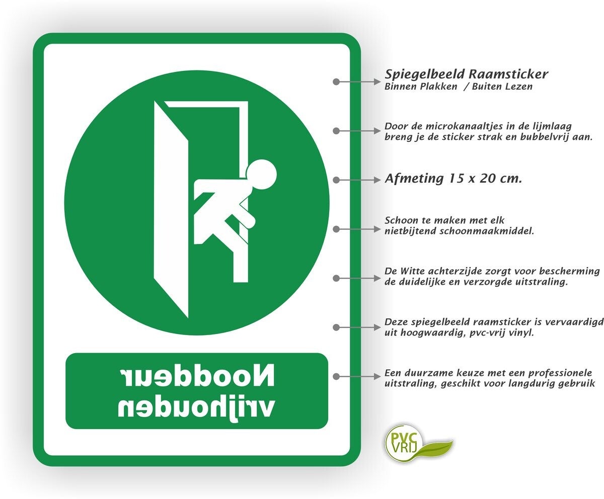 Bestel vandaag nog de Nooduitgang Vrijhouden Spiegelbeeld Raamsticker (15 x 20 cm) en zorg ervoor dat jouw nooduitgangen altijd goed zichtbaar en vrij toegankelijk zijn!
