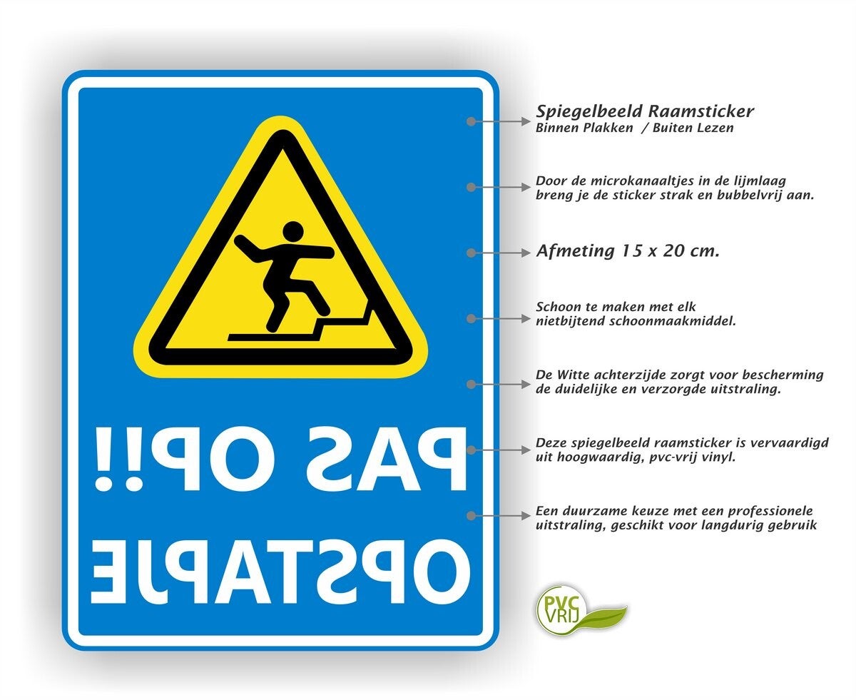 Kies voor deze praktische en heldere oplossing om uw gasten en uzelf te beschermen. Een kleine investering in de Pas op het opstapje-spiegelbeeldraamsticker 15x20 cm betekent een grote stap in veiligheid rondom uw entree en pand.